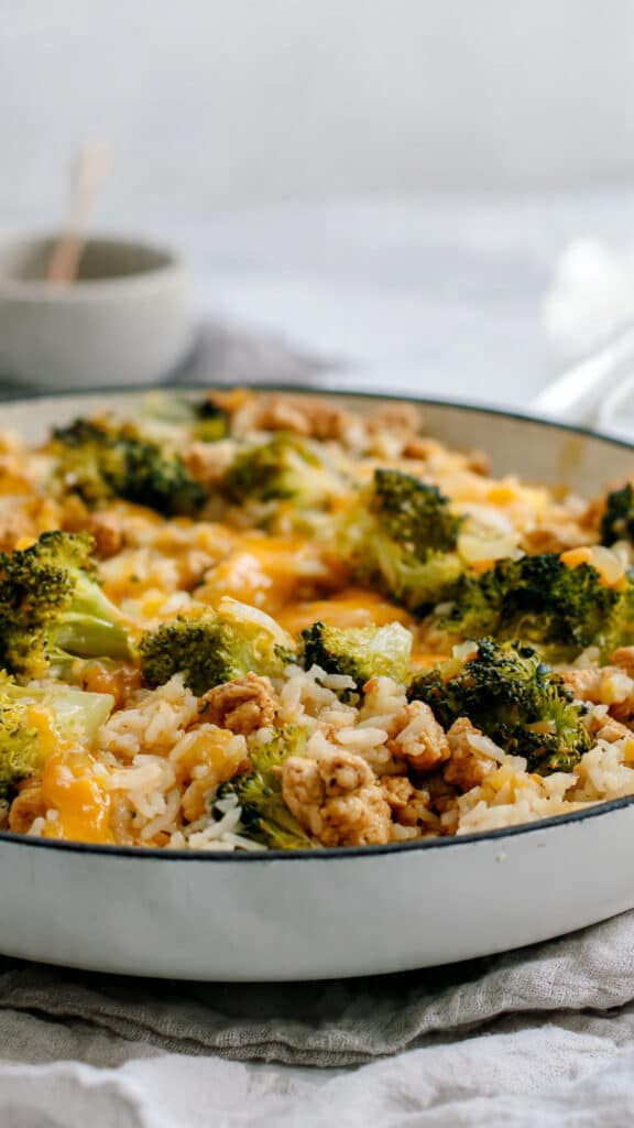 A creamy, comforting one pan broccoli cheddar chicken and rice skillet that comes together in just 30 minutes. Tender chicken, fluffy rice, and vibrant broccoli are coated in melty cheddar for a cozy, family friendly dinner.