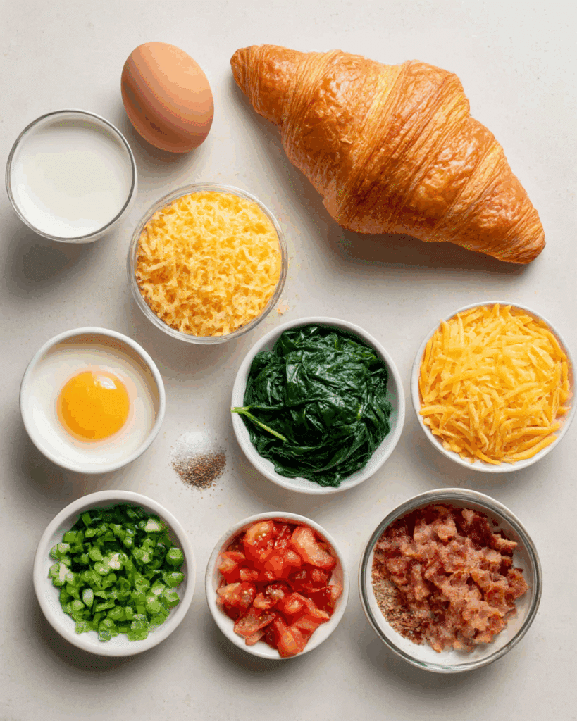 - Fill croissants: Layer with cheese, mix-ins, and egg mixture until nearly full