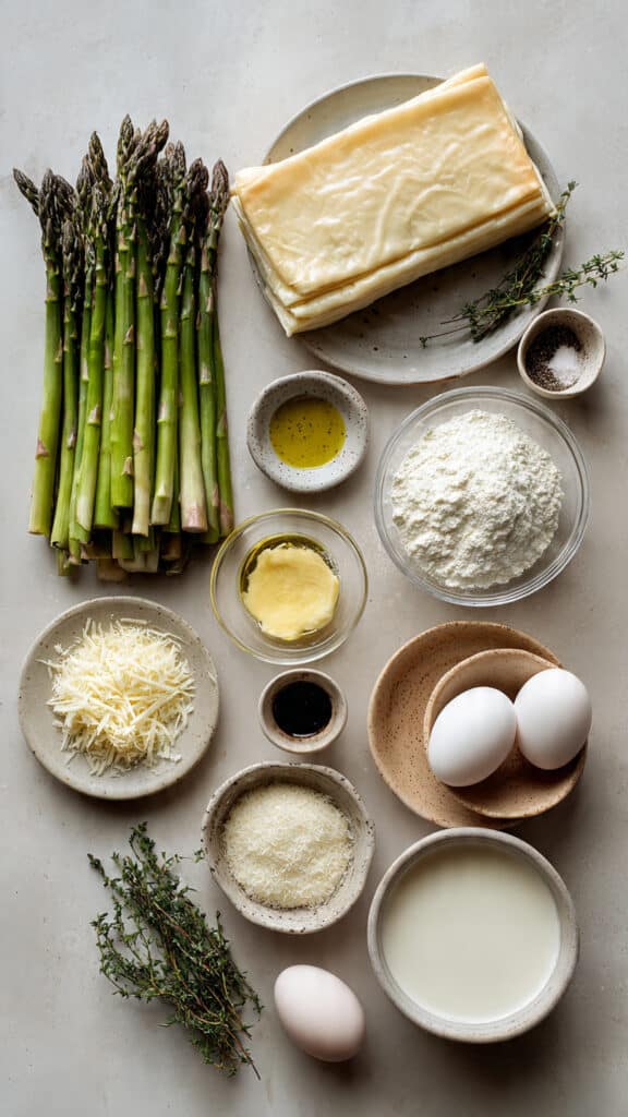 Taleggio Cheese: This soft Italian cheese melts into creamy pools with a mild tang, perfectly complementing the crisp pastry and fresh asparagus.