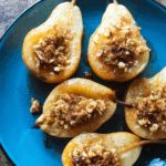 Tender pear halves filled with a warm cinnamon-spiced oat, nut, and cranberry filling. Naturally sweet, comforting, and perfect for a light dessert or brunch.