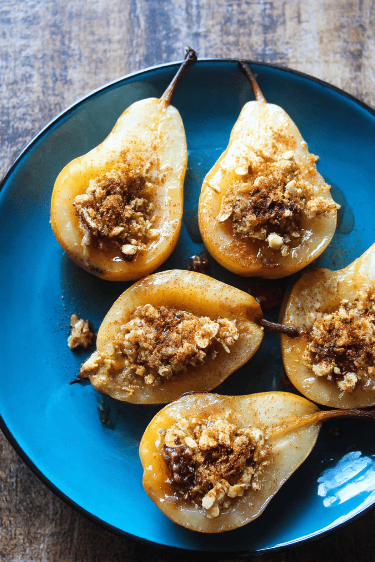 These baked pears have a soft, yielding texture contrasted by a crisp, toasty oat topping. The filling is warm, spiced, and a little chewy from the dried fruit. Each bite is sweet but not overpowering, making it feel indulgent and wholesome at the same time.