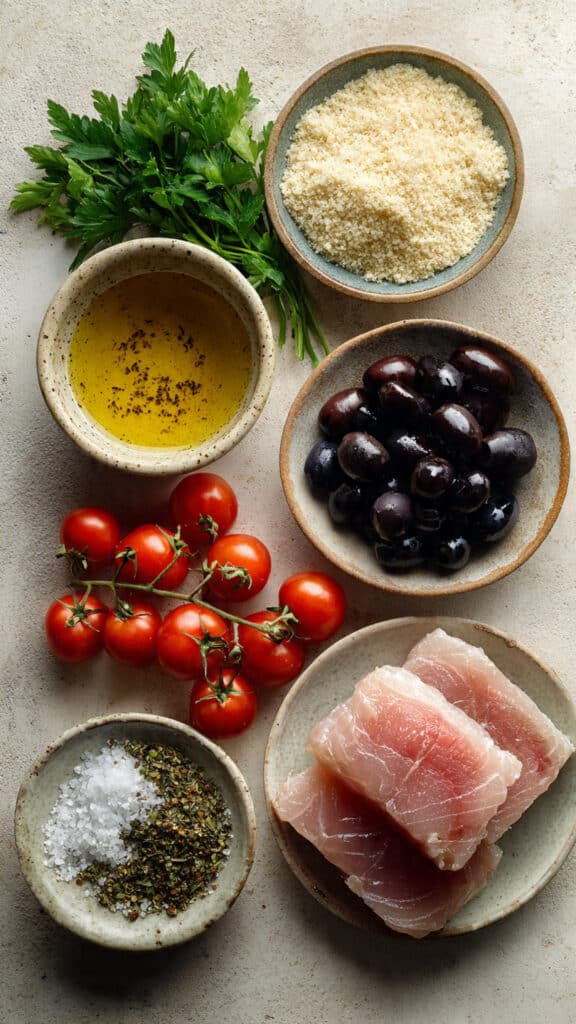 Swordfish: Known for its firm texture and mild flavor, swordfish holds up beautifully to baking and pairs well with bold Mediterranean ingredients.