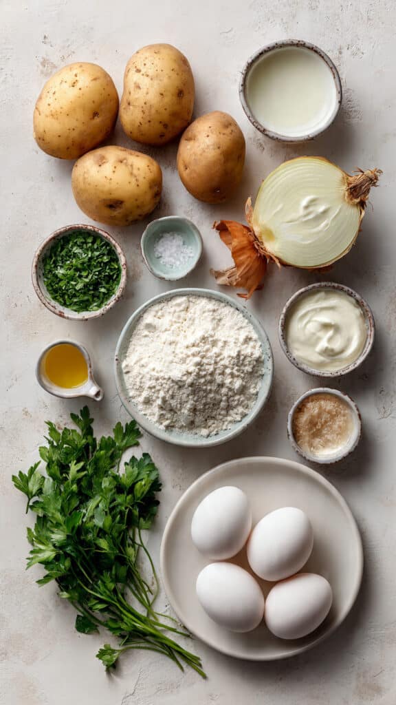 Potato fritters have popped up in cuisines around the world, from Jewish latkes to Indian aloo tikki and German Kartoffelpuffer. Each variation brings its own flair, but the core idea is always the same — take humble potatoes, add a few flavorful friends, and fry until crispy. The version we’re making today is inspired by Eastern European roots, where grated potatoes and onions meet fresh herbs and pantry staples for a crispy, craveable treat.