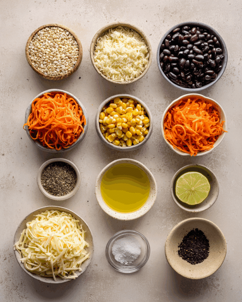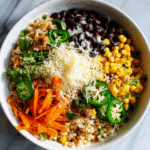 - Assemble the Dish: Add black beans, corn, shredded carrots, jalapeños, and cheese to the bowl.