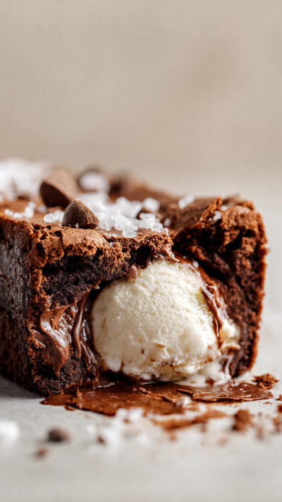 The contrast in this dessert is everything. The outer edges get chewy and crisp, while the center stays dense and molten. The brown butter and cocoa create a deep, toasty richness, and the cold ice cream melting into warm fudge brings temperature and texture contrast that’s just irresistible.