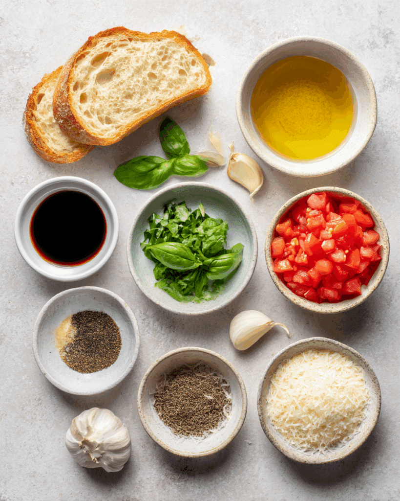 - Bread: 1 baguette or rustic Italian loaf, sliced into ½-inch pieces – Acts as the crispy, toasty canvas.