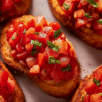 Crispy toasted bread topped with juicy tomatoes, fragrant basil, and a hint of garlic and olive oil. This classic Italian bruschetta is fresh, flavorful, and perfect as a quick appetizer or snack.