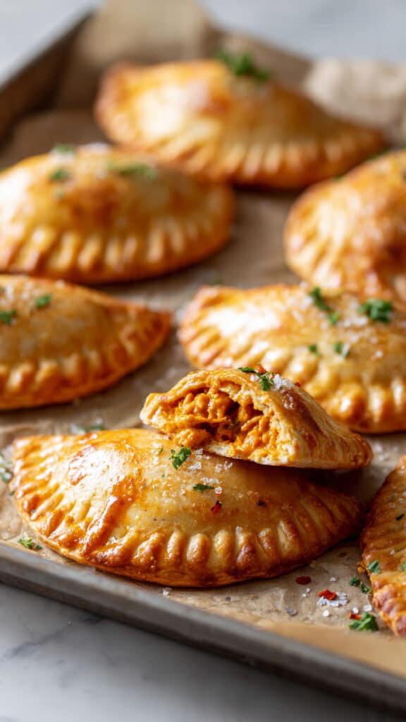 Flaky golden empanadas stuffed with creamy, spiced butter chicken filling, baked until crisp and finished with a fresh herb sprinkle.