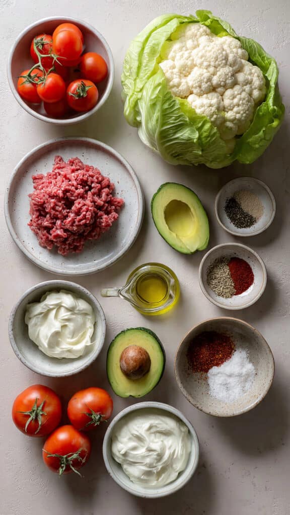 You get warm, seasoned ground beef, fluffy cauliflower rice soaking up all those spices, creamy avocado to cool things down, and a drizzle of spicy sauce that ties it all together. It is the kind of dinner that feels indulgent but still keeps things light and balanced.