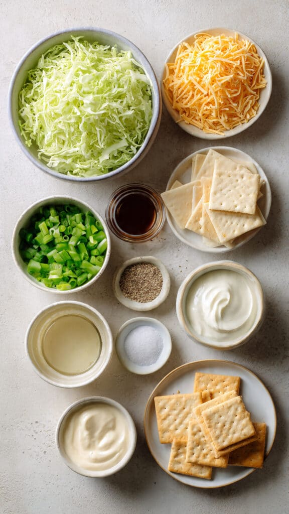 The cabbage stays crisp while absorbing the creamy dressing. The cheddar adds richness and depth, and the vinegar provides a subtle tang that keeps each bite balanced. The crackers add a light crunch that contrasts beautifully with the creamy slaw.