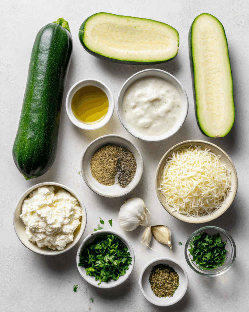 - Zucchini: 4 medium (about 6–7 inches each). They act as tender boats holding all the creamy, cheesy goodness.