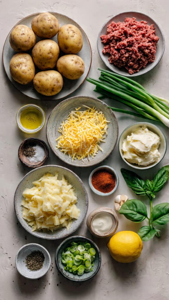 - Russet Potatoes: 6 medium, baked and halved, create the crispy base.