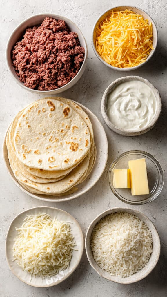 The magic is in the contrast — crispy exterior, gooey melted cheese, juicy seasoned beef, and soft, starchy rice. Each bite is balanced with heat, richness, and creaminess. Melting the cheese between two tortillas adds a crunch that puts this miles ahead of a basic burrito.