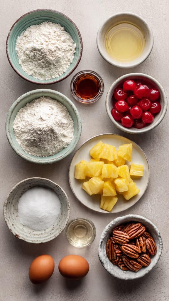 - In a large bowl, combine flour, sugar, baking powder, and salt. Toss in candied pineapple, drained cherries, and pecans.