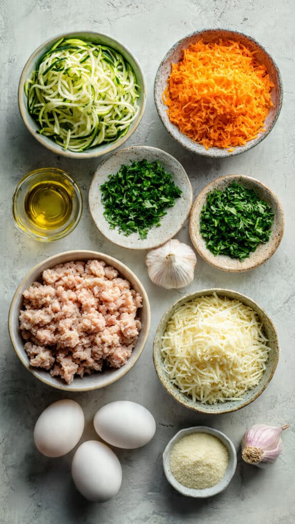 - Combine Ingredients: In a large bowl, mix ground chicken, grated carrot, zucchini, onion, mozzarella, parmesan, 1/2 cup breadcrumbs, eggs, garlic, parsley, salt, and black pepper until just combined.