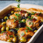 A classic, savory-sweet Mediterranean-inspired dish featuring tender chicken thighs baked with prunes, olives, capers, and herbs in a rich, tangy marinade.