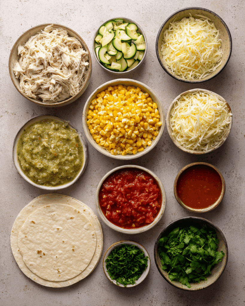 - Combine Ingredients: In a bowl, mix the shredded chicken, green enchilada sauce, corn, zucchini, and cilantro until everything is evenly coated.
