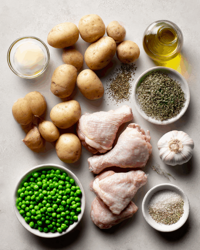 This dish is all about contrasts and harmony. The skin on the chicken turns delightfully crisp while the meat stays juicy and tender. Potatoes become creamy inside with crisp golden edges. The peas offer just the right snap of freshness, and the garlicky sauce coats everything with a rich, herbaceous warmth that lingers after every bite.