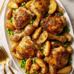 This dish is all about contrasts and harmony. The skin on the chicken turns delightfully crisp while the meat stays juicy and tender. Potatoes become creamy inside with crisp golden edges. The peas offer just the right snap of freshness, and the garlicky sauce coats everything with a rich, herbaceous warmth that lingers after every bite.