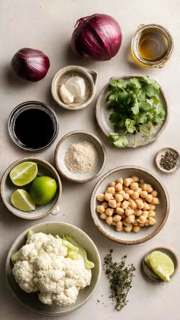 The flavor profile leans into bold street food energy, think lime, chili, herbs, and creamy sauce layered into something handheld and satisfying. Chickpeas and cauliflower are humble ingredients, but when roasted with garlic powder, coriander, thyme, and onion powder, they transform into something deeply savory.
