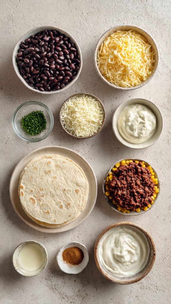 Ingredients in Chipotle Black Bean Quesadillas with Cumin and Chive Dipping Sauce
