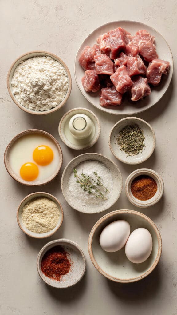 - Pat the pork cubes dry before breading so the coating sticks well.