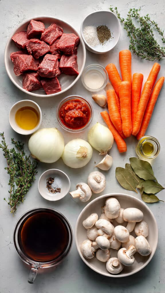 - Assemble the Dish: In the same pot, sauté garlic briefly, then stir in tomato paste and cook for one minute. Add carrots, pearl onions, and mushrooms. Return the beef to the pot. Pour in red wine and beef broth, then add thyme and bay leaves.