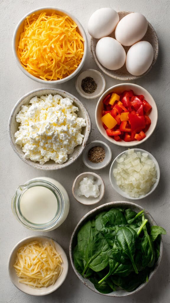 - Combine Ingredients: In a large mixing bowl, whisk together cottage cheese, eggs, milk, salt, black pepper, and garlic powder until smooth. Stir in chopped spinach, diced bell pepper, diced onion, and 1 cup of shredded cheddar.