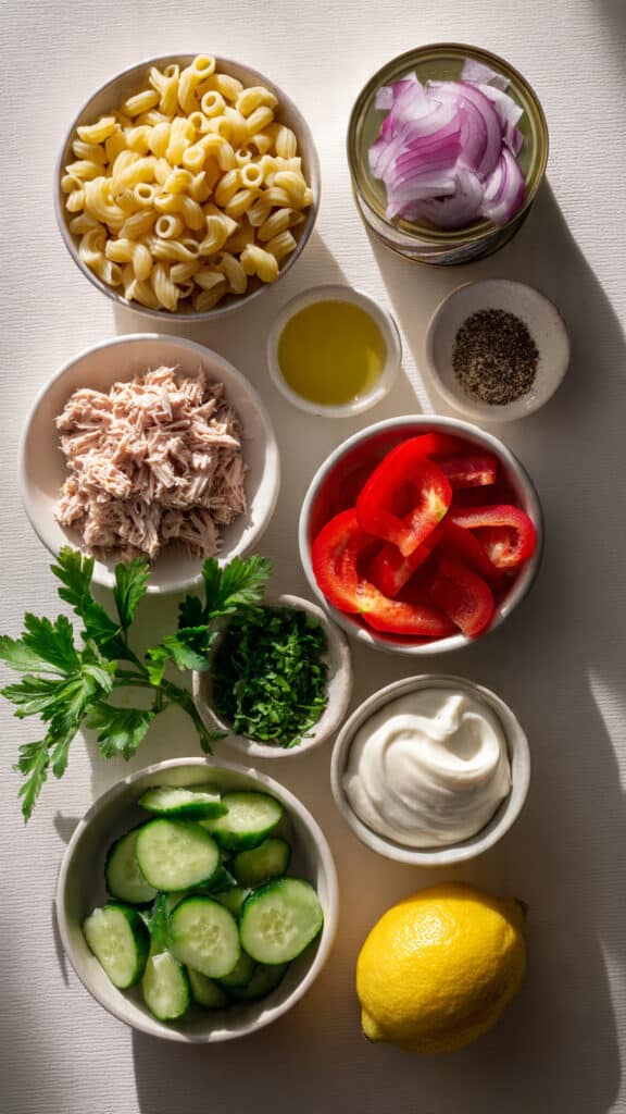 The key to this salad’s craveability is contrast. The pasta is soft but firm, the tuna flaky, the veggies crisp and juicy. The creamy dressing binds it all while the lemon and herbs brighten each bite. It’s light yet filling, fresh yet satisfying.