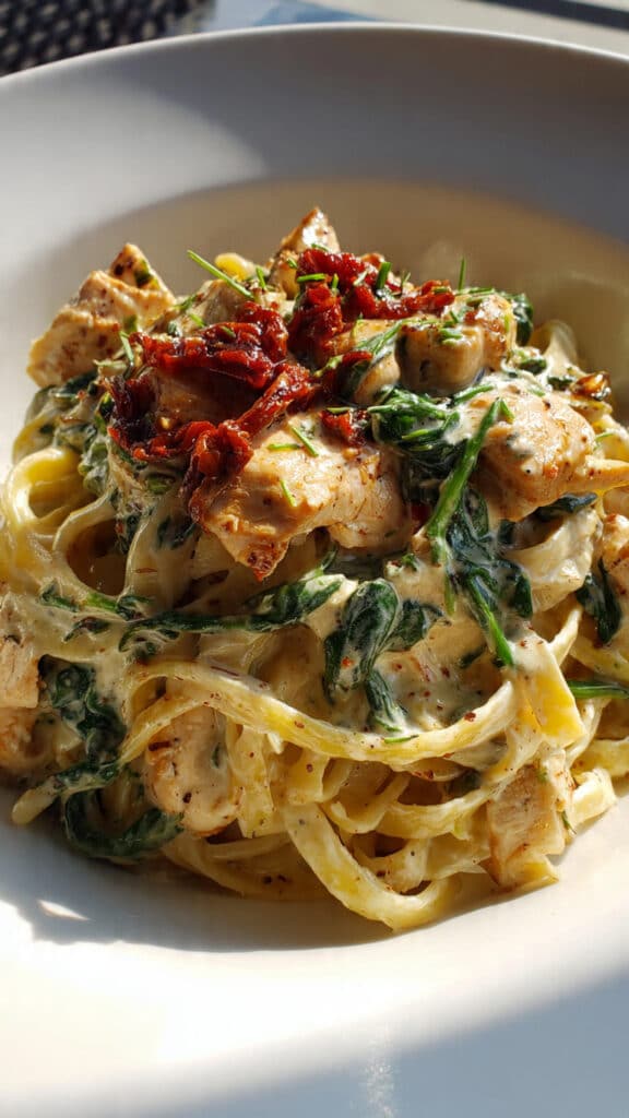This dish is a masterclass in balance — creamy yet bright, hearty yet fresh. The sauce clings beautifully to the pasta, while the chicken stays juicy from the sear. The sun-dried tomatoes and herbs bring pops of flavor that make the creaminess feel light instead of heavy.