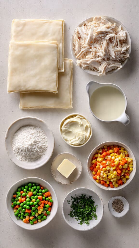 - All-Purpose Flour: 2 tablespoons. Thickens the sauce to create that comforting pot pie texture.