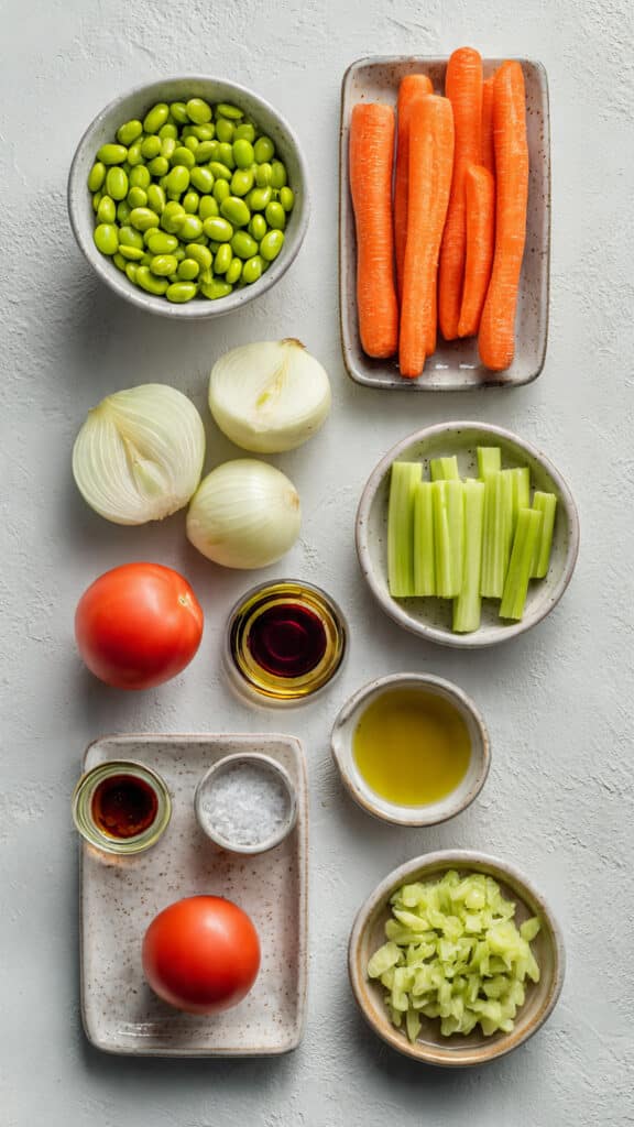 This recipe came to life during one of those “what do I have in the fridge?” moments. A handful of edamame from the freezer, some colorful carrots and celery, a ripe tomato, and half a Vidalia onion later—boom, salad magic. Tossed it all with olive oil and vinegar, gave it a little salt, and the result was something so good it quickly became a staple. It’s become a favorite for lunch prep and lazy dinners, and it never fails to hit the spot.