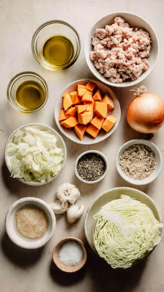 - Prepare Your Cooking Vessel: In the same skillet, add the remaining olive oil. Sauté the diced onion, garlic, cabbage, and sweet potato until softened, about 6–8 minutes.