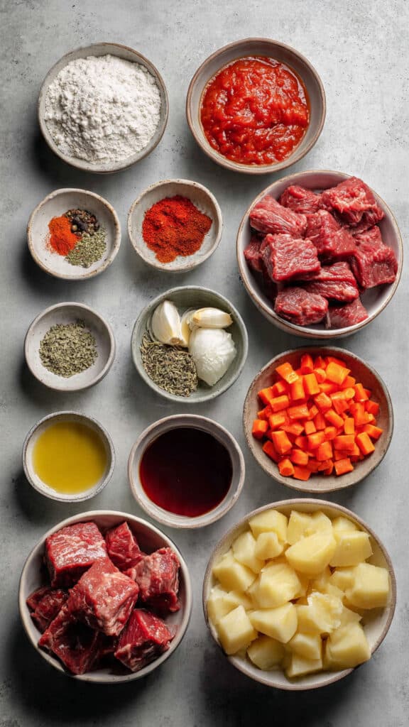 - All-Purpose Flour: ½ cup, coats the beef for a light crust and thickens the stew.