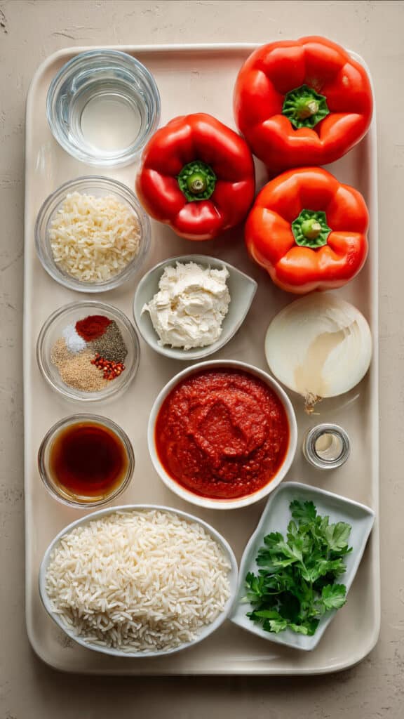 This recipe came together on one of those nights when I wanted something bold but didn’t want to sacrifice comfort. I had peppers on the counter, leftover rice in the fridge, and a fresh jar of my favorite tomato sauce. A little spice here, a swirl of vegan cream cheese there — and the firecracker name practically wrote itself. These peppers hit that sweet spot of cozy and exciting, and now they’re a staple in my dinner rotation.