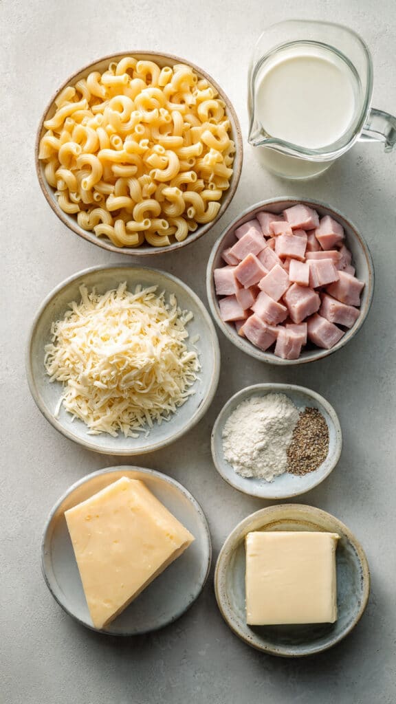 This is not your average stovetop macaroni. This version is baked until lightly golden, allowing the cheese sauce to thicken beautifully around every curve of pasta. The diced ham brings a savory depth that balances the creaminess, while Gruyere adds that unmistakable nutty richness.