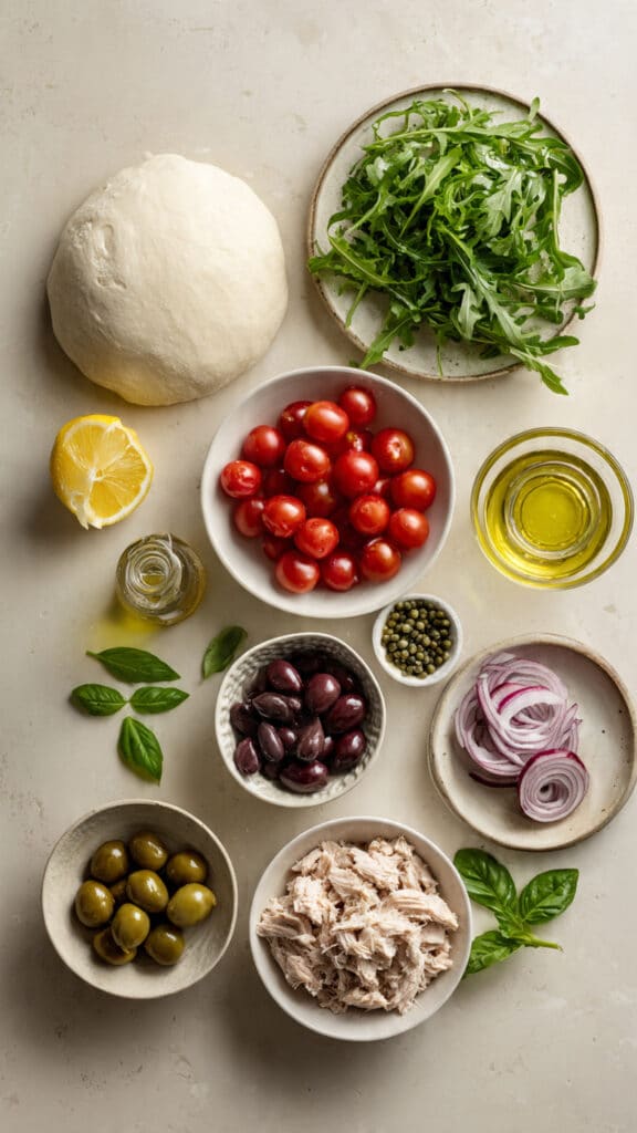 A bright and fresh Mediterranean-inspired pizza topped with tuna, cherry tomatoes, olives, arugula, and lemon zest on a crisp golden crust — light, flavorful, and perfect for any occasion.