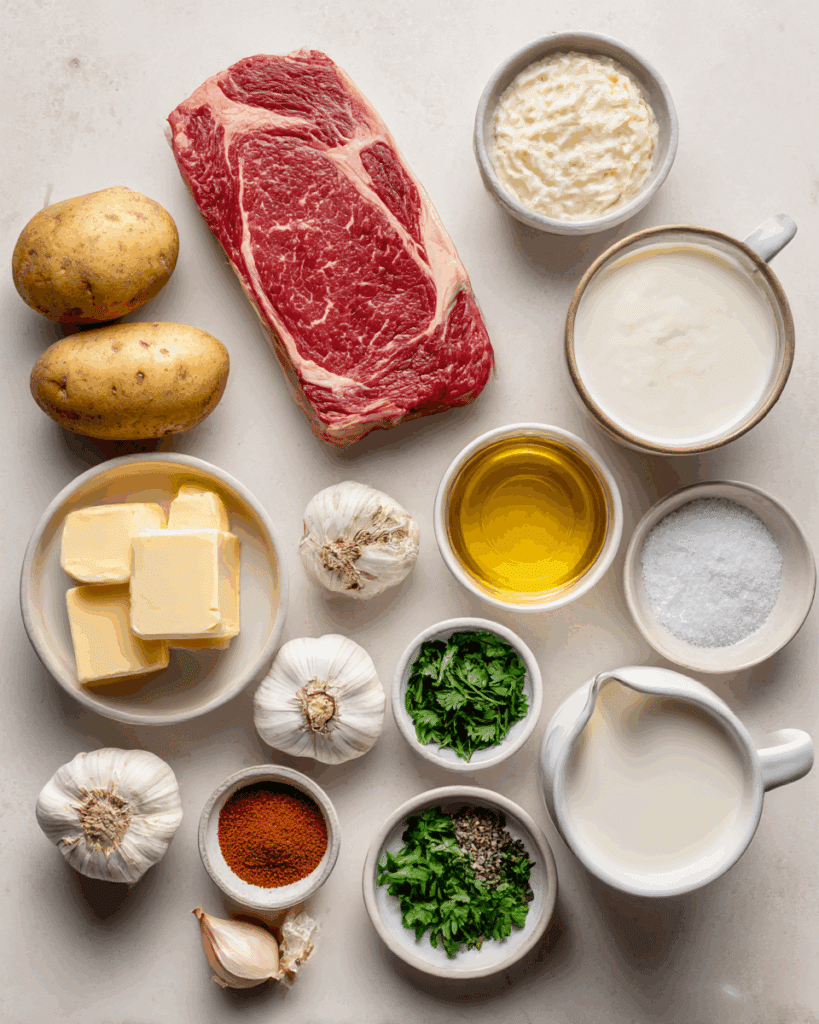 Ingredients in Garlic Butter Beef Bites with Creamy Mashed Potatoes