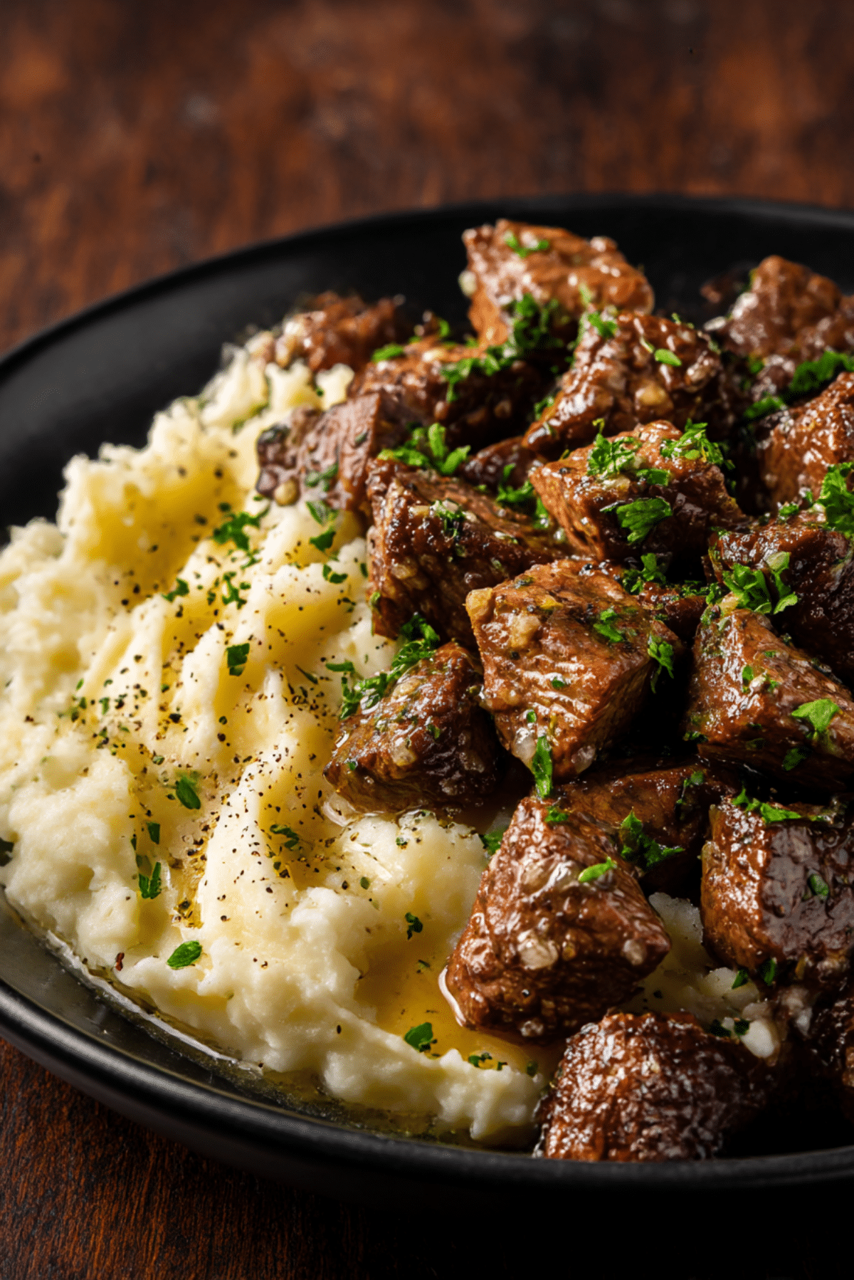 How to Serve Garlic Butter Beef Bites with Creamy Mashed Potatoes