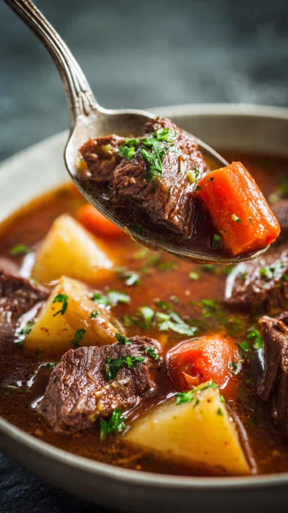 This version keeps that tradition alive. Slow simmering allows the beef to become fork tender while the vegetables soften and release their natural sweetness into the broth.