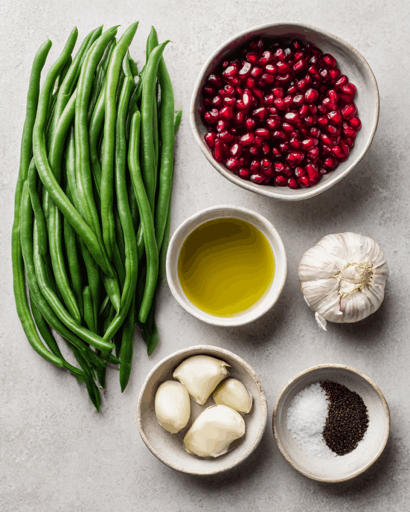 A fresh and vibrant side dish featuring crisp green beans tossed in garlicky olive oil and topped with juicy pomegranate seeds. A colorful, healthy, and festive addition to any meal.