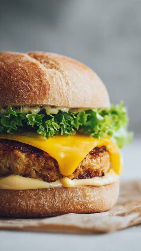 Stack the burger high with vibrant green lettuce and perfectly melted cheese. Serve on a wooden board with fresh vegetables on the side for a clean, inviting presentation.