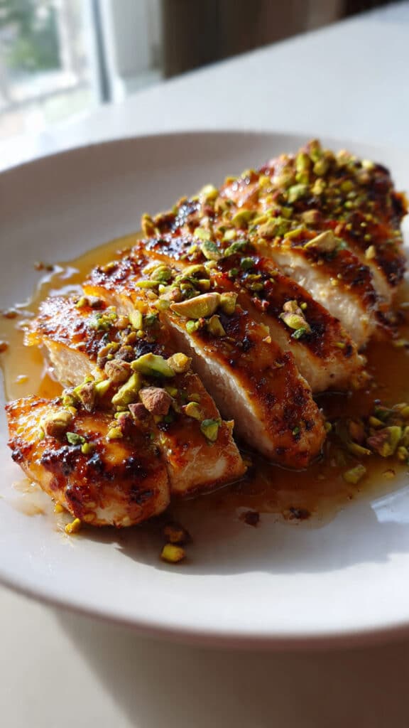 This recipe is perfect for prepping in advance. You can season the chicken and refrigerate it up to 24 hours before cooking. Leftovers keep well in the fridge for 3 days. Reheat gently in a pan or microwave. To freeze, slice the cooked chicken and store in airtight containers (note: pistachios may lose crunch when frozen).