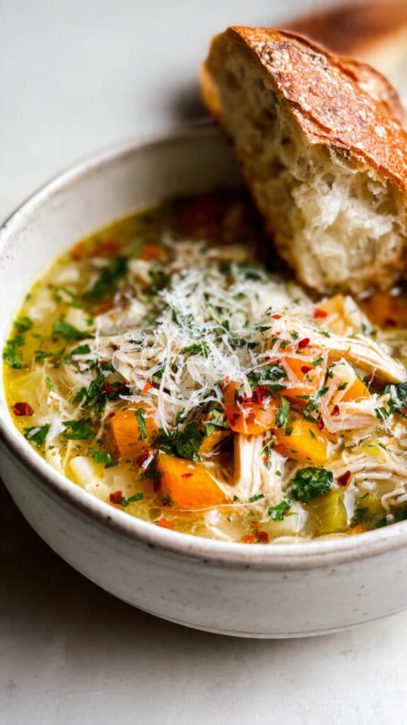 What makes this soup irresistible is the balance. The broth is rich and silky, thanks to long-simmered bones and olive oil. The tender shredded chicken is satisfying and hearty. The vegetables stay soft but not mushy, and the garlic-tomato base infuses every bite with warmth. A squeeze of lemon at the end wakes everything up, and the optional parmesan and chili oil add next-level flavor.