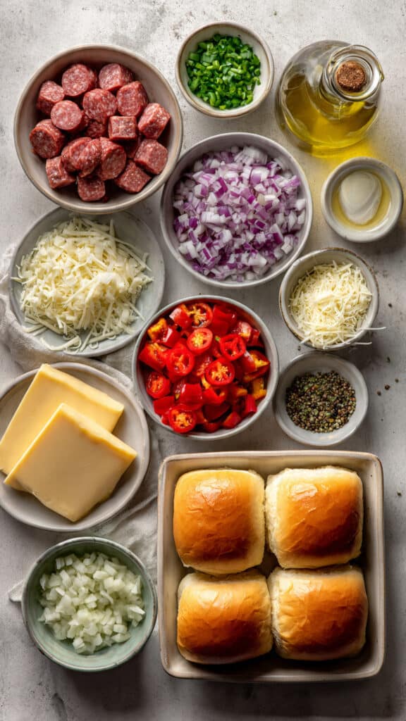 - Muenster Cheese: 3 slices – Melty and mild, balances the spicy sausage.
