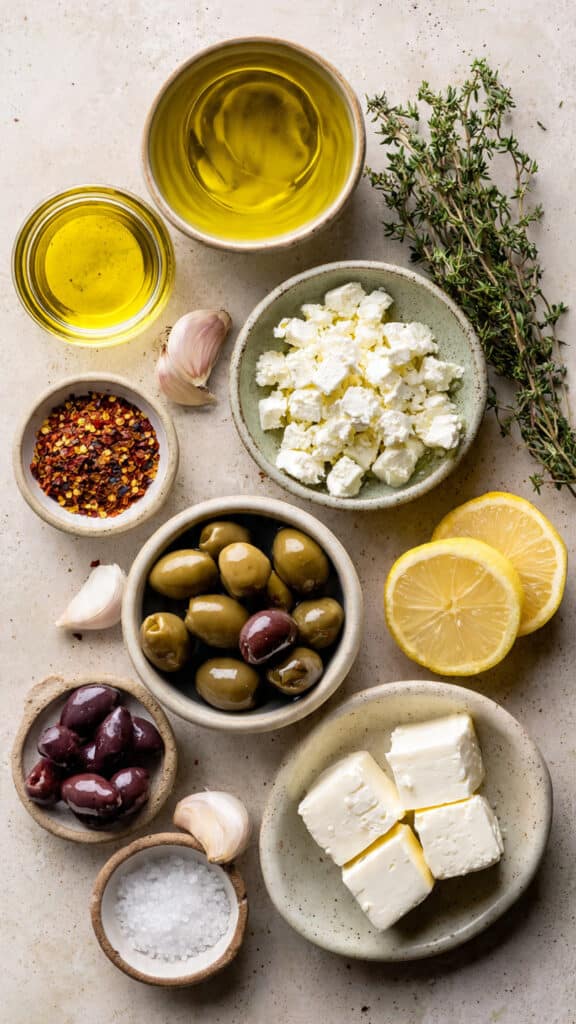 This Marinated Olives and Feta Cheese recipe is a quick, elegant Mediterranean appetizer made with creamy feta cubes, buttery Castelvetrano olives, garlic, thyme, lemon zest, and a hint of red pepper. All tossed in fragrant extra-virgin olive oil and finished with flake salt and black pepper.