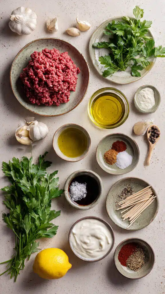 - Combine Ingredients: In a large bowl, mix ground beef, minced garlic, half of the chopped parsley, cilantro, paprika, cumin, 1 teaspoon salt, and black pepper until just combined.