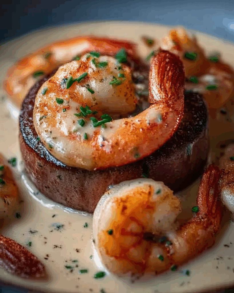 A luxurious surf-and-turf dish featuring tender filet mignon topped with juicy shrimp and finished with a silky lobster cream sauce — perfect for special occasions or an elegant dinner at home.