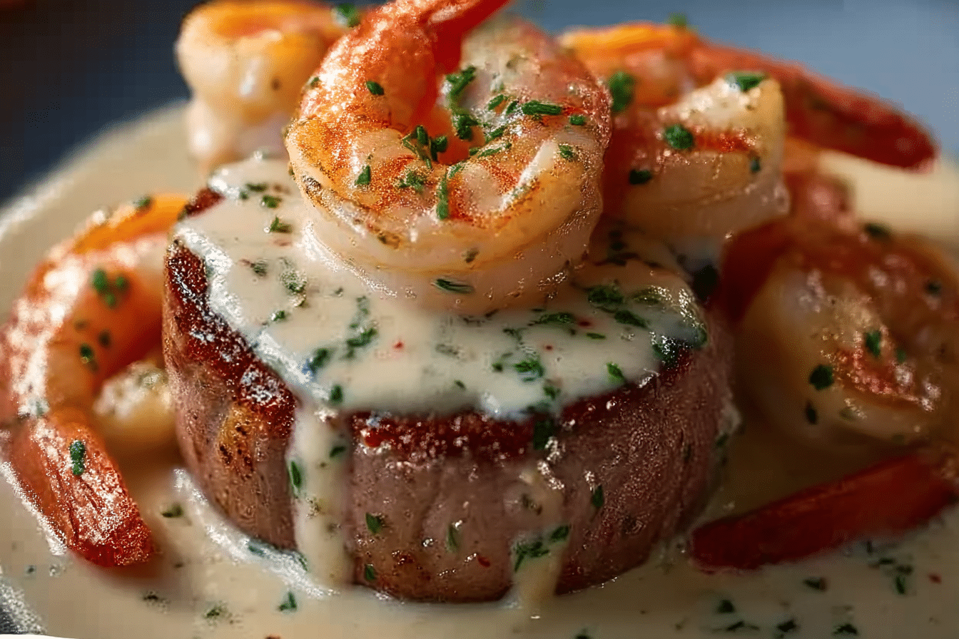 A luxurious surf-and-turf dish featuring tender filet mignon topped with juicy shrimp and finished with a silky lobster cream sauce — perfect for special occasions or an elegant dinner at home.