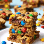 These chewy Monster Cookie Bars are loaded with oats, peanut butter, chocolate chips, and colorful M&M’s. They’re the perfect fun and satisfying treat for kids and adults alike.